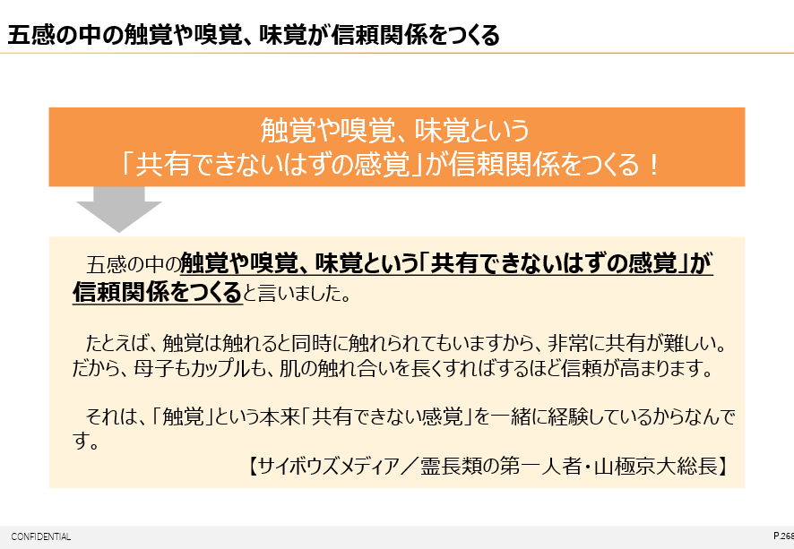 『 五感の中の触覚や嗅覚、味覚という「共有できないはずの感覚」が信頼関係をつくる。たとえば、触覚は触れると同時に触れられてもいますから、非常に共有が難しい。だから、母子もカップルも、肌の触れ合いを長くすればするほど信頼が高まります。