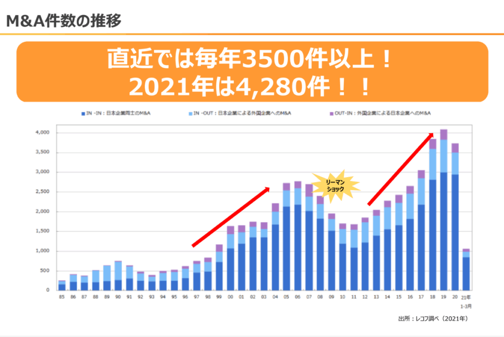 直近のデータでお話しすると、ここ数年は毎年3500件以上、2021年では4300件ほど年間でM&Aが行われています。