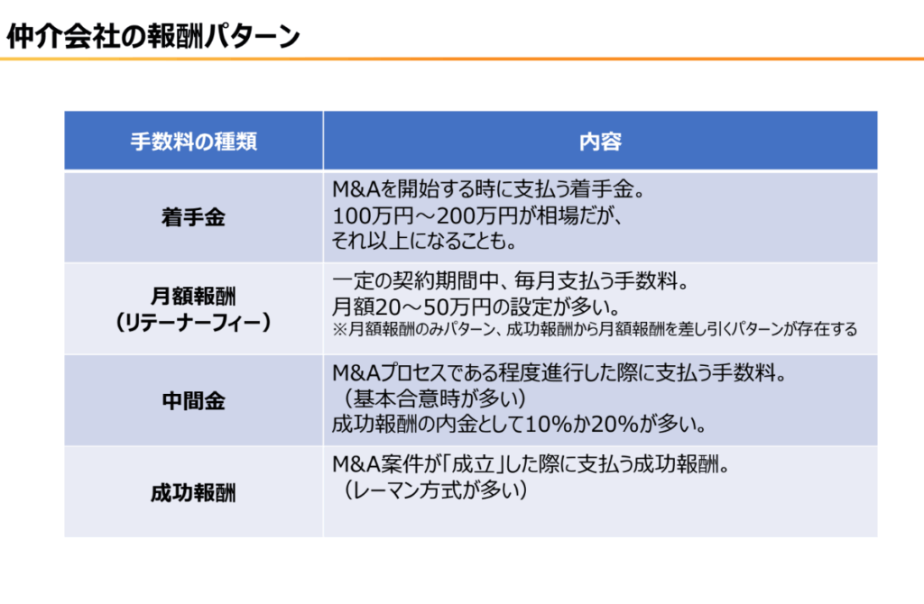 ただ、M&Aの仲介会社は仲介手数料がとにかく高いです。一般的に仲介会社は以下のような報酬パターンを持っています。